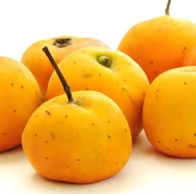 El tejocote es una fruta originaria de México, pequeña y redonda, de color naranja con pecas, pulpa amarillenta y sabor ácido. Es rico en vitaminas A y C, fibra y antioxidantes
